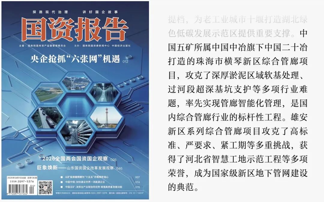 4月14日,由国务院国有资产监督管理委员会主管,国资委新闻中心与中国经济出版社联合主办的《国资报告》2026年第4期,特别策划《央企抢抓“六张网”机遇》专题报道,聚焦央企在“六张网”建设中的实践与作为,其中着重推介了中国二十冶在综合管廊领域的标杆项目成果、技术创新优势及未来发展布局,充分肯定了其在地下综合管廊建设领域的引领作用。